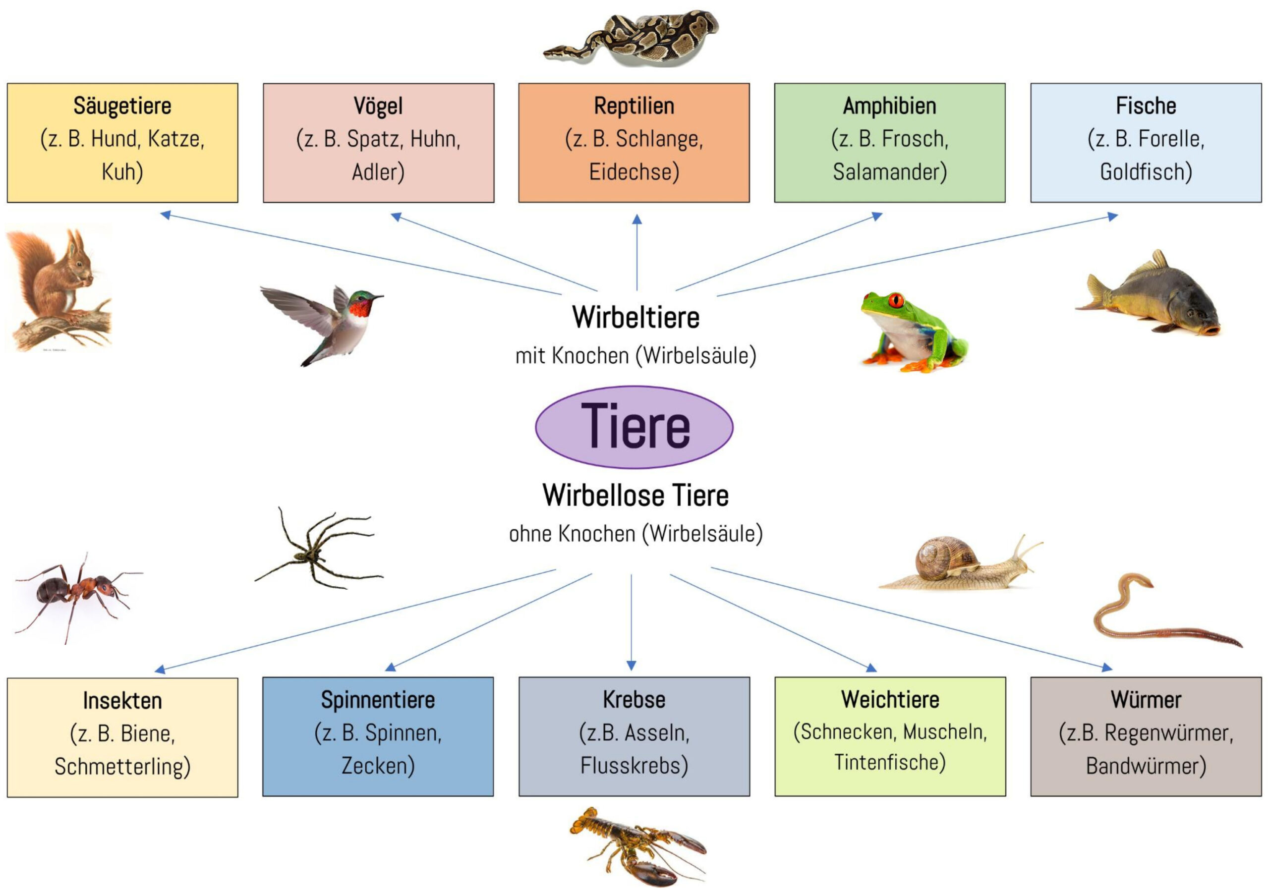 - Fische: leben im Wasser, haben Schuppen und Kiemen.